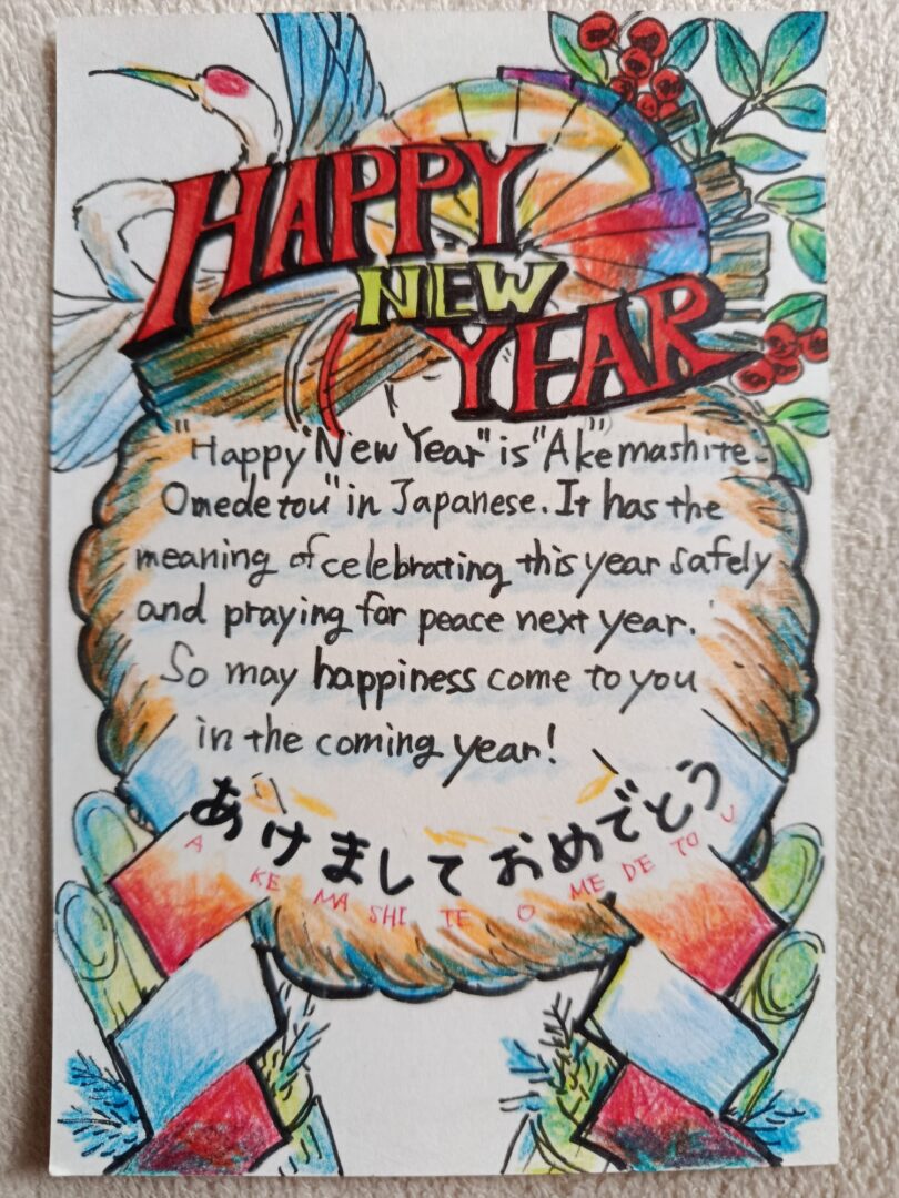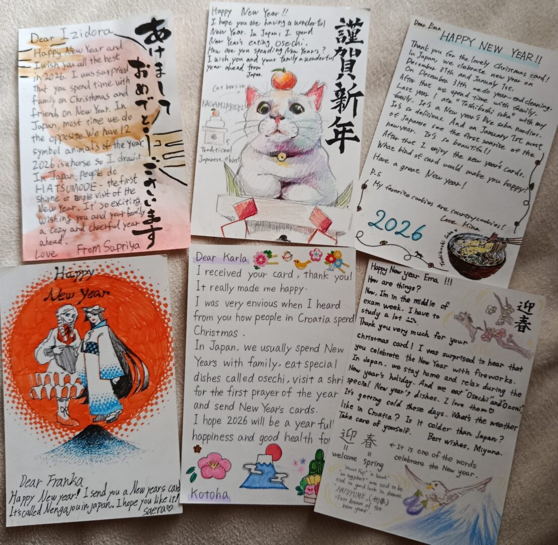 Potaknuti čestitkama naših učenika, japanski su se učenici potrudili objasniti i svoje novogodišnje običaje pa smo tako imali priliku naučiti puno o japanskoj kulturi. Tako smo saznali da se za Novu godinu priprema kagami mochi, tradicionalni kolač od riže koji simbolizira sreću i blagostanje, kao i osechi, poseban blagdanski obrok koji se sastoji od raznih jela, od kojih svako ima svoje značenje. Ozoni je juha s mochi kolačićima, dok se toshikoshi soba (rezanci od heljde) jedu uoči Nove godine kao simbol dugog života. Učenici su nam također približili običaj hatsumode, prvog posjeta hramu u novoj godini, te hatsuhinode, promatranje prvog izlaska sunca kao znaka novog početka. Saznali smo i za hatsuyume, prvi san u novoj godini koji, prema vjerovanju, može donijeti sreću, kao i otoshidama, novčane darove koje djeca dobivaju od odraslih. Posebno zanimljiv bio je i kotatsu, niski stol s grijačem ispod kojeg se obitelj okuplja tijekom hladnih zimskih dana.