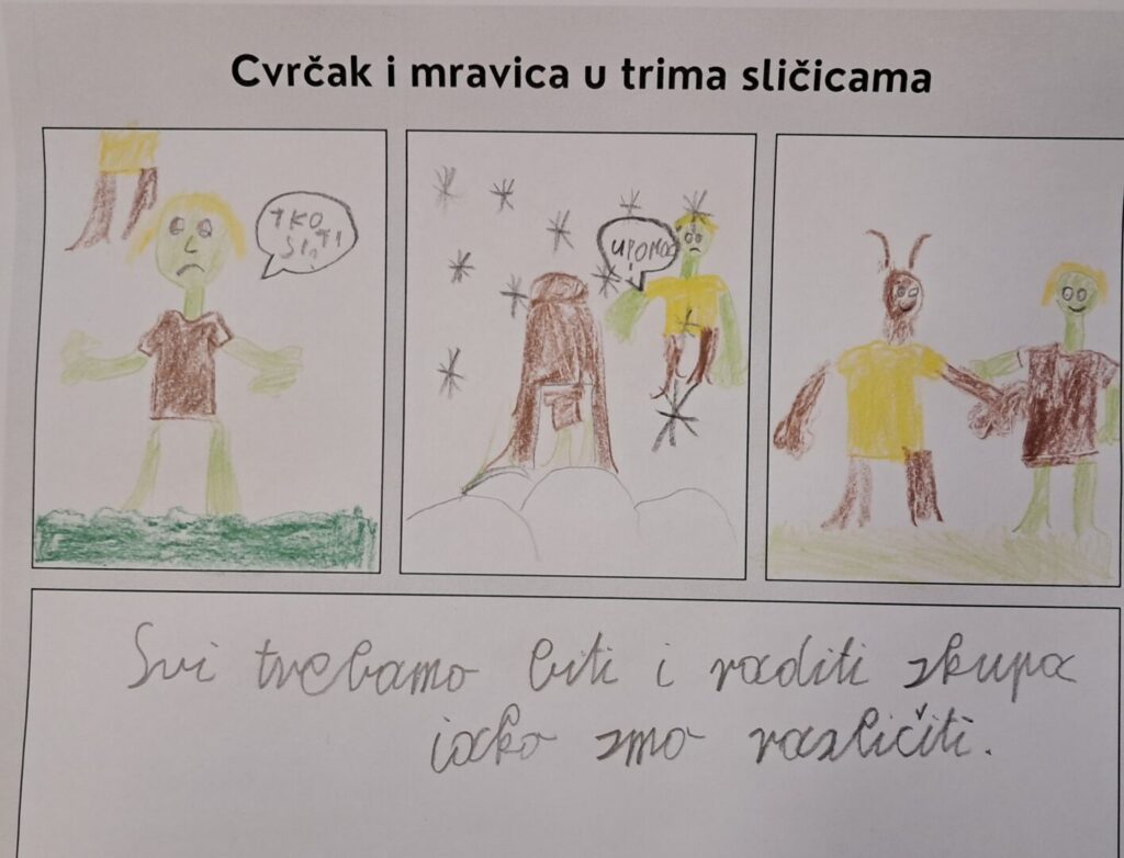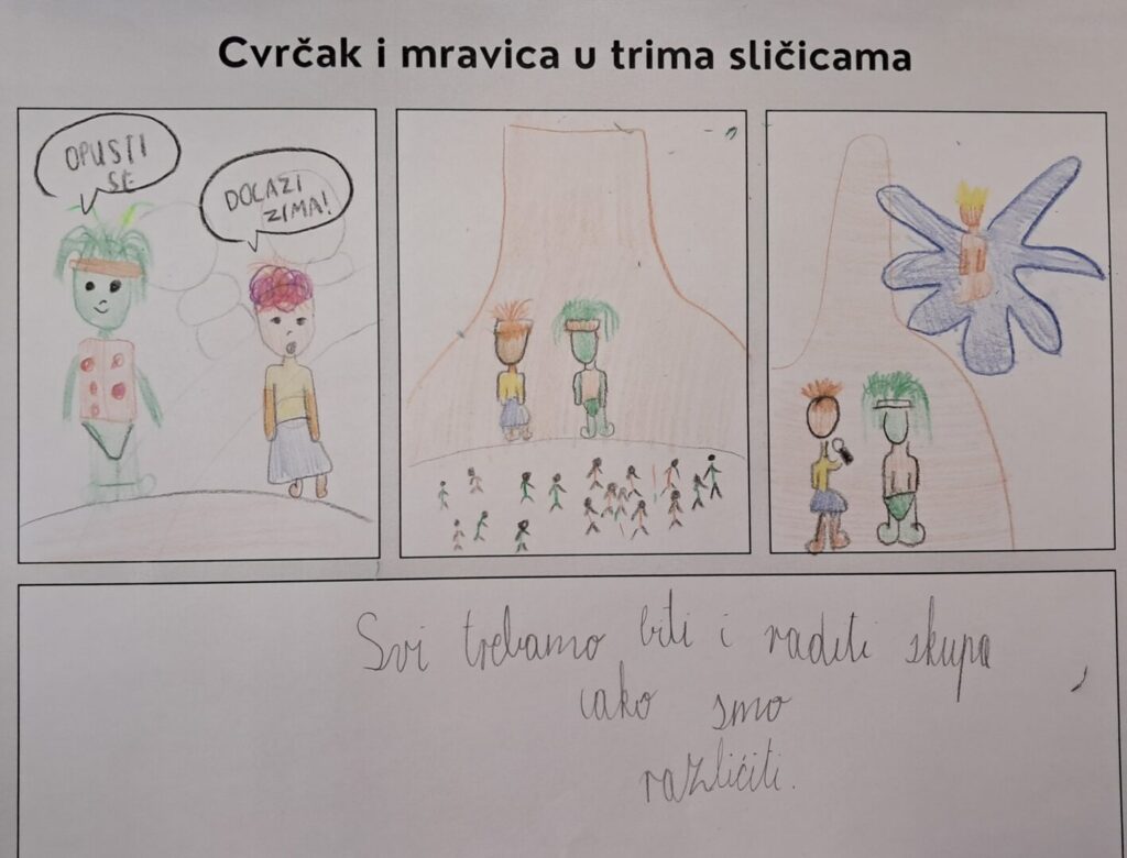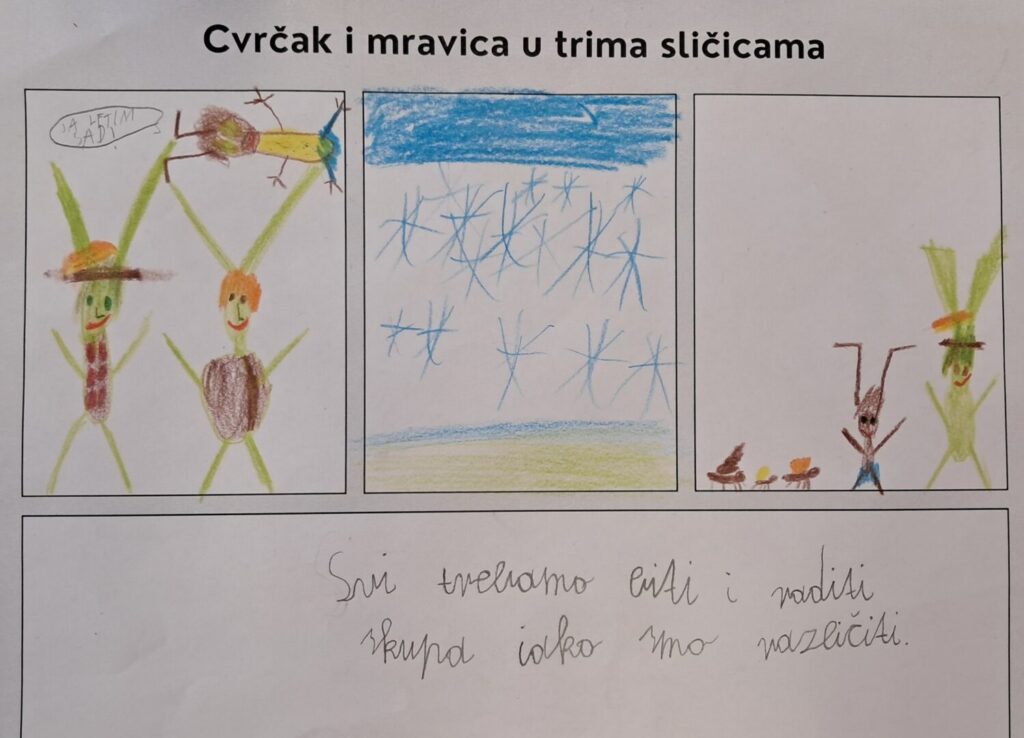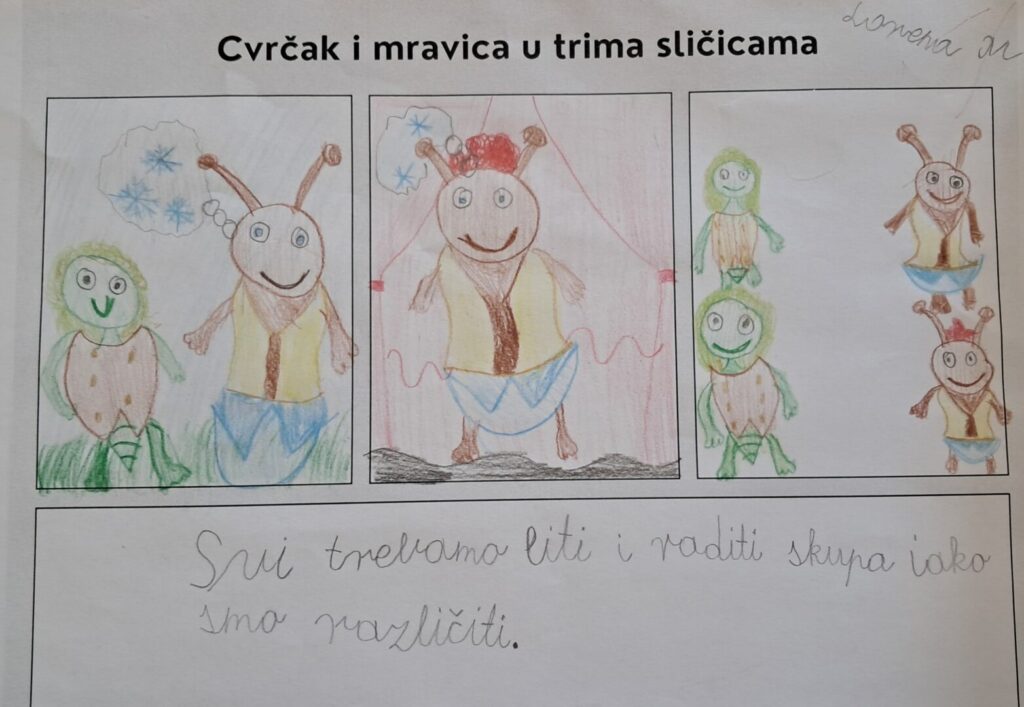 U utorak, 24. veljače učenici 3.d razreda obilježili su Dan materinskog jezika uz portal Vrti svoj film. Pogledali su dugometražni animirani film Cvrčak i mravica redatelja Luke Rukavine. Prije gledanja filma razgovarali su o pročitanim Ezopovim basnama i rješavali listić na kome su trebali povezati životinju i pripadajuću osobinu. Tijekom gledanja filma obratili su pozornost na izgled i ponašanje glavnih i sporednih likova, glazbu i poruku filma. Nakon gledanja crtežom su prikazali glavne događaje u filmu. Gledanje filmova omogućuje povezano ostvarivanje ishoda iz hrvatskog jezika i međupredmetnih tema, učenici razvijaju medijsku pismenost te se kod učenika potiče motvacija i empatija.