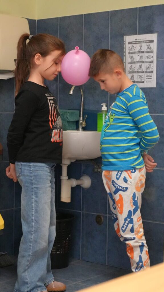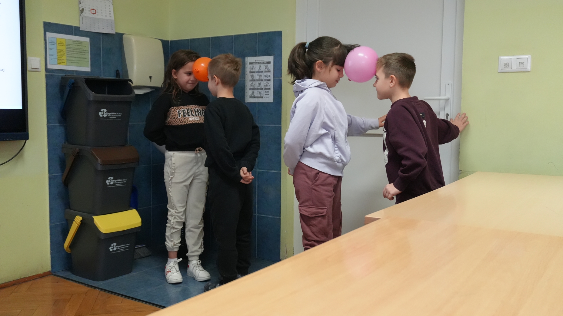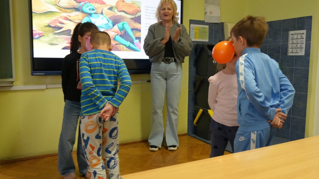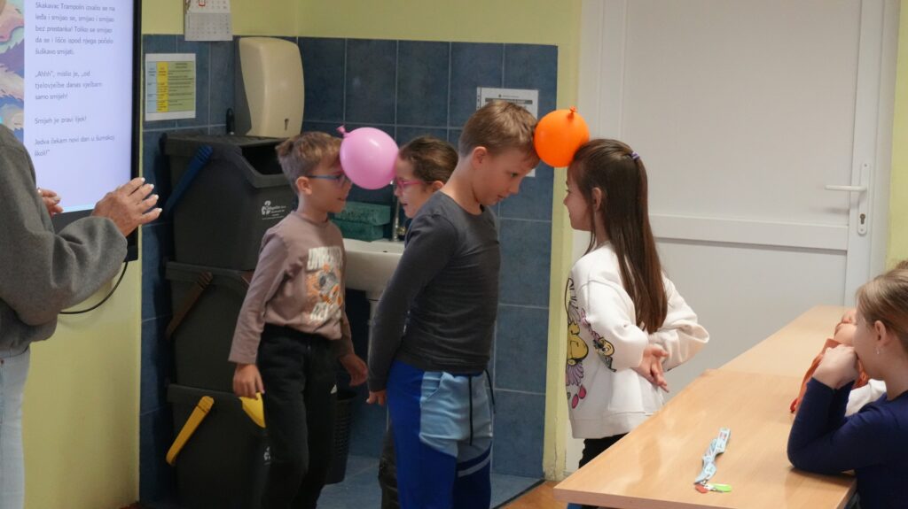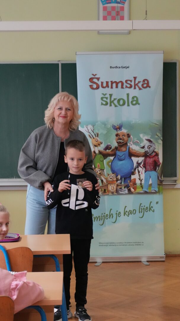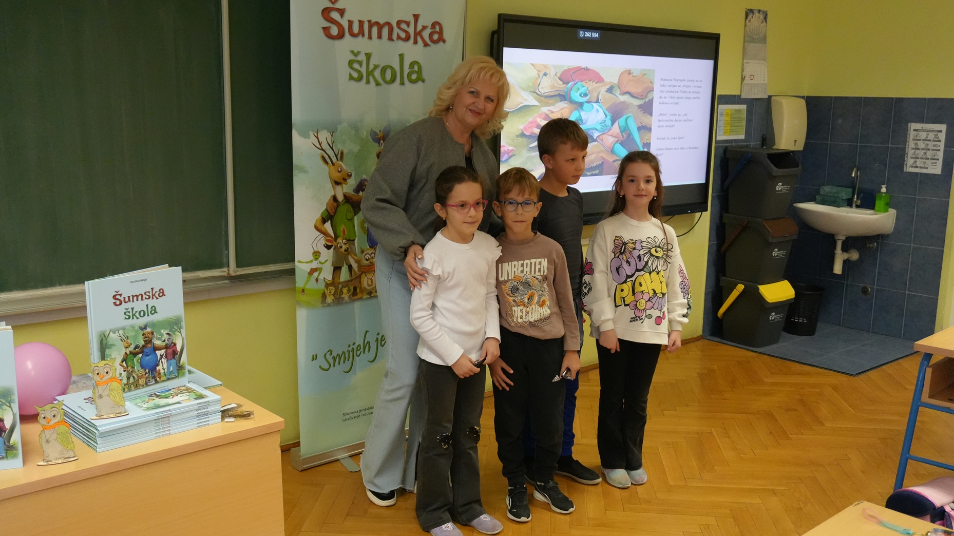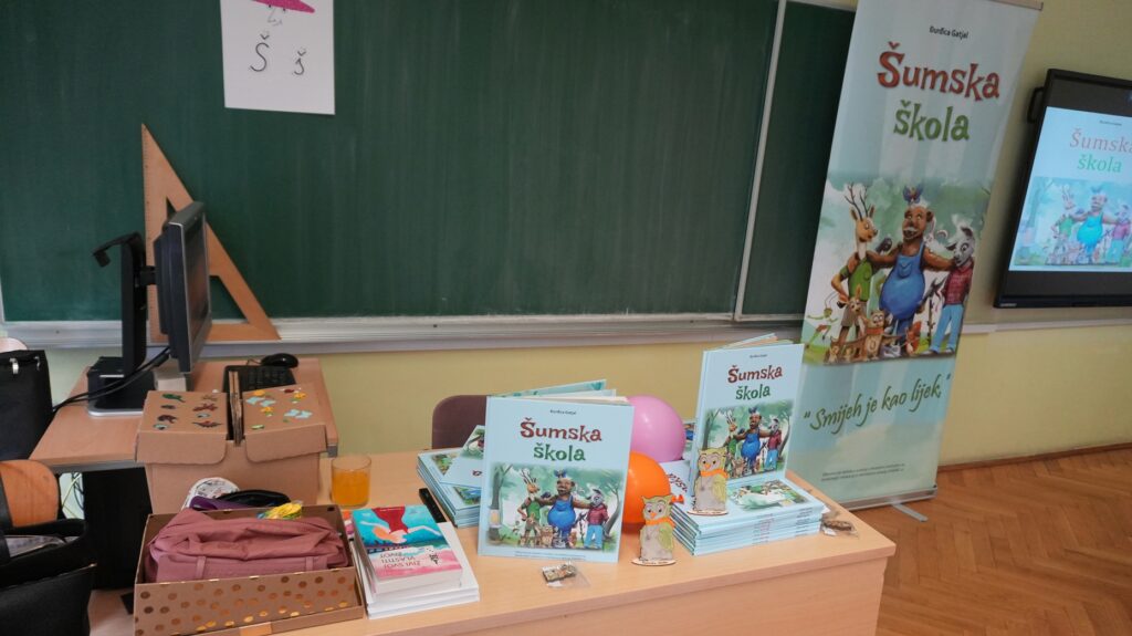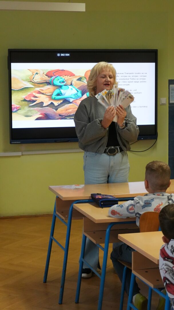 Susret je započeo kratkom najavom i upoznavanjem s učenicima uz nekoliko zagonetki, predstavljanjem slikovnice Šumska škola, njenih likova i događaja putem kojih je učenike poučavala vedrini, otkrivanju i njegovanju talenata, što je bilo vrlo dinamično i učenicima zabavno. Uslijedilo je natjecanje u parovima gdje je zadatak bio bočnim kretanjem prenijeti napuhani balon koji se nalazi između nasuprotnih glava dvoje učenika preko dijela učionice, a da pri tome balon ne ispadne. Susret smo priveli kraju podjelom bookmarka koje je učenicima priredila književnica, a koje oni sami trebaju ukrasiti svojim imenom i talentom te pokojim crtežom. Inače, cijeli susret je bio prožet pitanjima i odgovorima učenika, njihovim idejama i mislima, malim nagradama za pojedine aktivnosti itd.