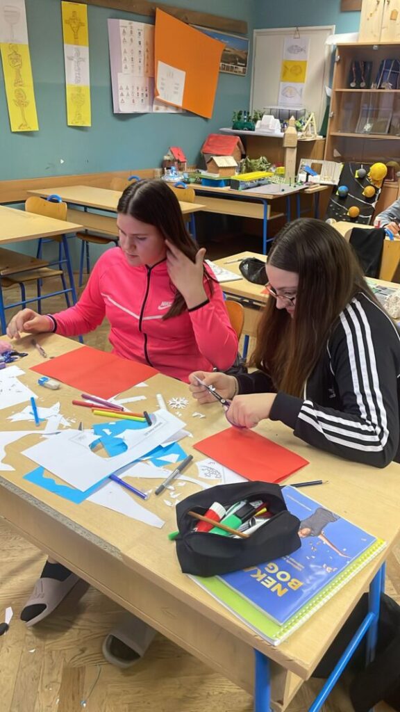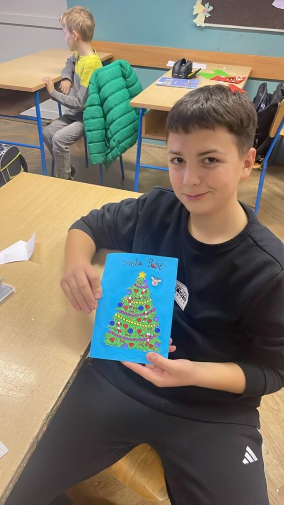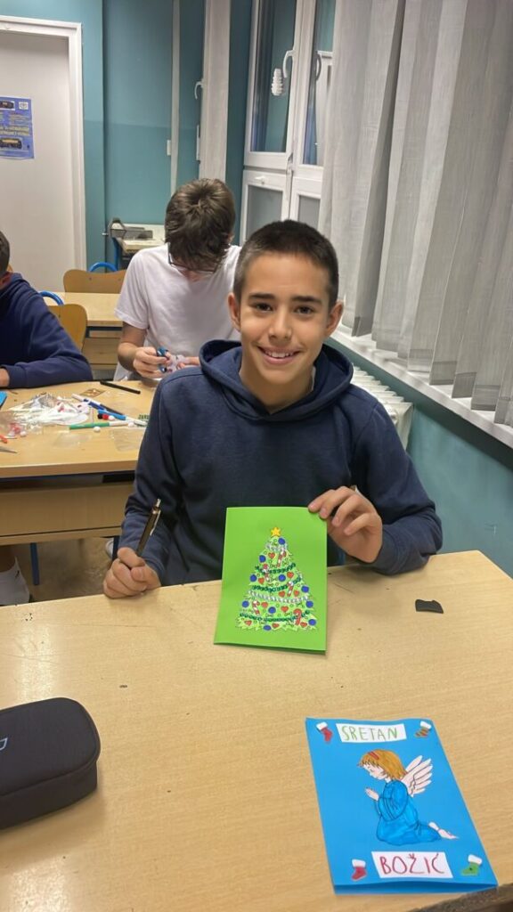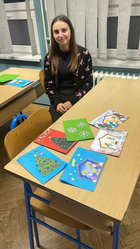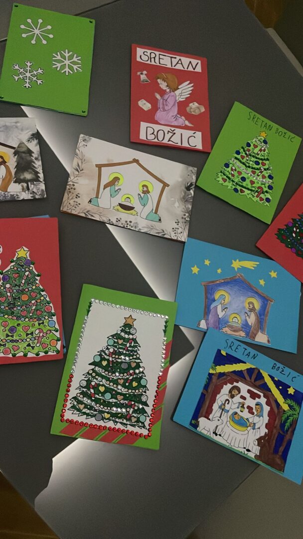 U drugoj fazi projekta učenici sedmog razreda, uz vodstvo vjeroučiteljice Andrijane Petrović, s puno su truda i veselja izrađivali božićne čestitke. Rezali su, bojali i lijepili papirnate božićne motive stvarajući maštovite i razigrane čestitke. Kroz rad i kreativnost izrazili su želju podijeliti dobrotu i radost Božića s drugim učenicima.