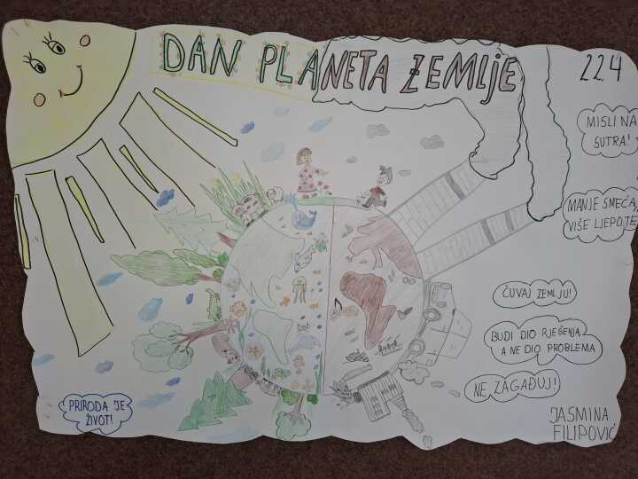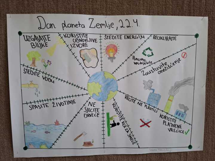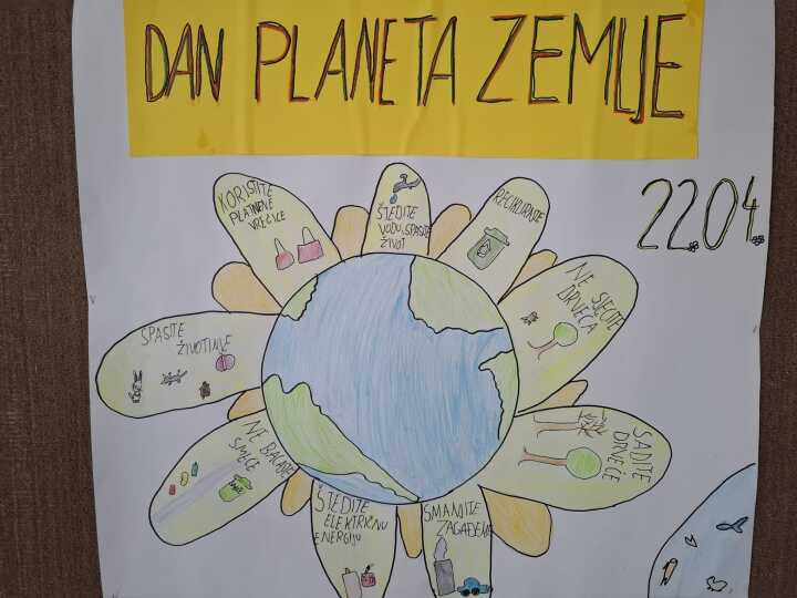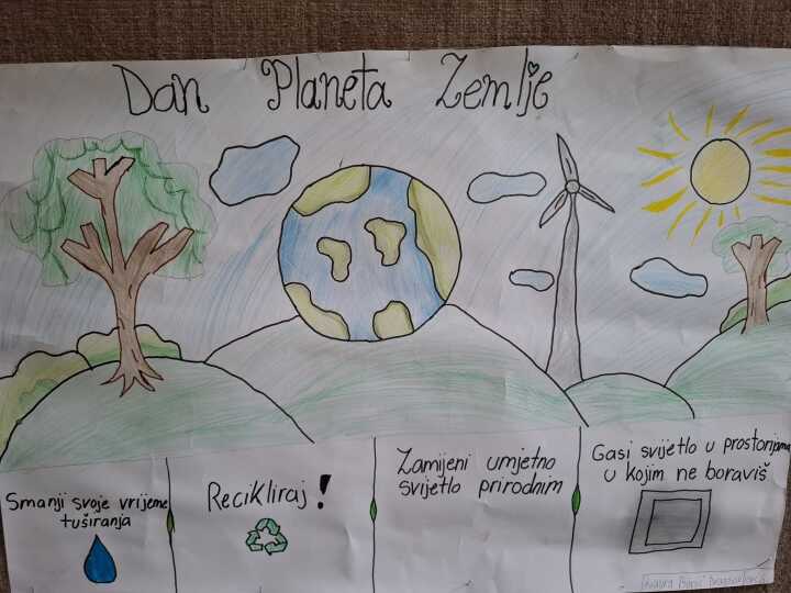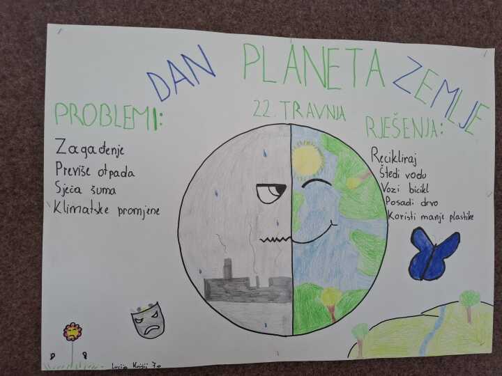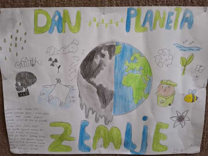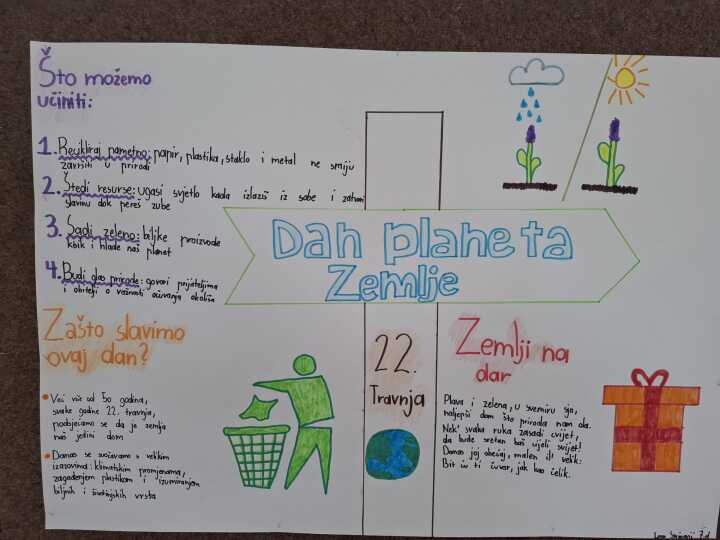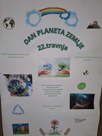 Učenici 6. i 7. razreda, na poticaj nastavnice Geografije Branke Vuković, sudjelovali su u obilježavanju Dana planeta Zemlje (22. travnja) kroz izradu edukativnih i kreativnih plakata. Kroz ovaj zadatak istraživali su važnost očuvanja okoliša, klimatske promjene te načine na koje svatko može pridonijeti zaštiti prirode. Učenici su pokazali su veliku maštovitost i odgovornost, a njihovi plakati krasili su školske hodnike i podsjećali sve na važnost brige za naš planet. Najkreativniji su bili Leon Strinavić, Petra Isaković, Sara Ruškan, Sara Rajh, Jasmina Filipović, Lucija Križić, Loren aTusić, Željka Radelić, Izabela Čolić, Sabina Hercog, Laura Benić i Ema Lekić.