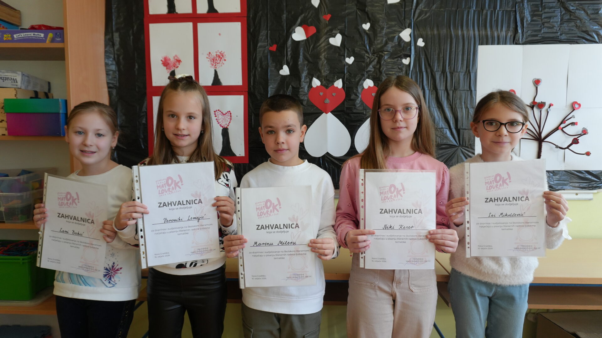 Povjerenstvo je imalo težak zadatak odabrati najbolje radove koji će biti nagrađeni. Ipak, neki su se učenici posebno istaknuli te su nagrađeni za svoje literarne uratke. To su učenici razredne nastave: Veronika Lemajić, Lea Mikolčević i Marin Miler iz 2.a razreda. Njihova mentorica je učiteljica Ivana Franić Galik.