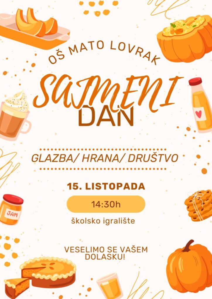 posjetite nas na Sajmenom danu koji će se održati u srijedu, 15. listopada 2025., na igralištu naše škole u vremenu od 14:30 do 17 sati.