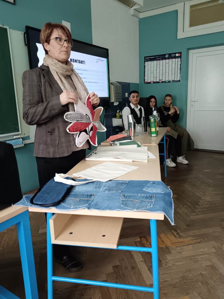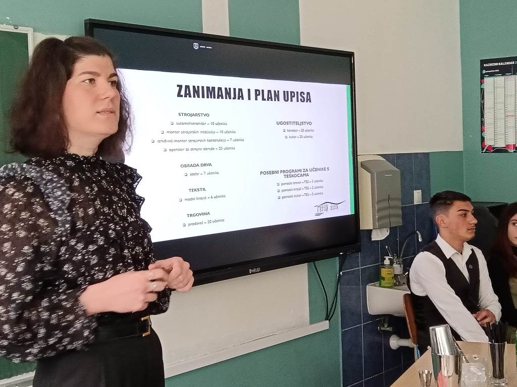 Psihologinja Majda Joha upoznala je učenike sa zanimanjima, načinom bodovanja i potrebnom dokumentacijom koja je važna za upis. Gospođa Dragica Kekez govorila je o smjeru- modni krojač te predstavila njihove radove. Predstavnice učenika, demonstrirale su njihove modne kreacije. Naš bivši učenik Nedo Stambolija predstavio je zanimanje konobara i vješto pokazao pravljenje i posluživanje pića.