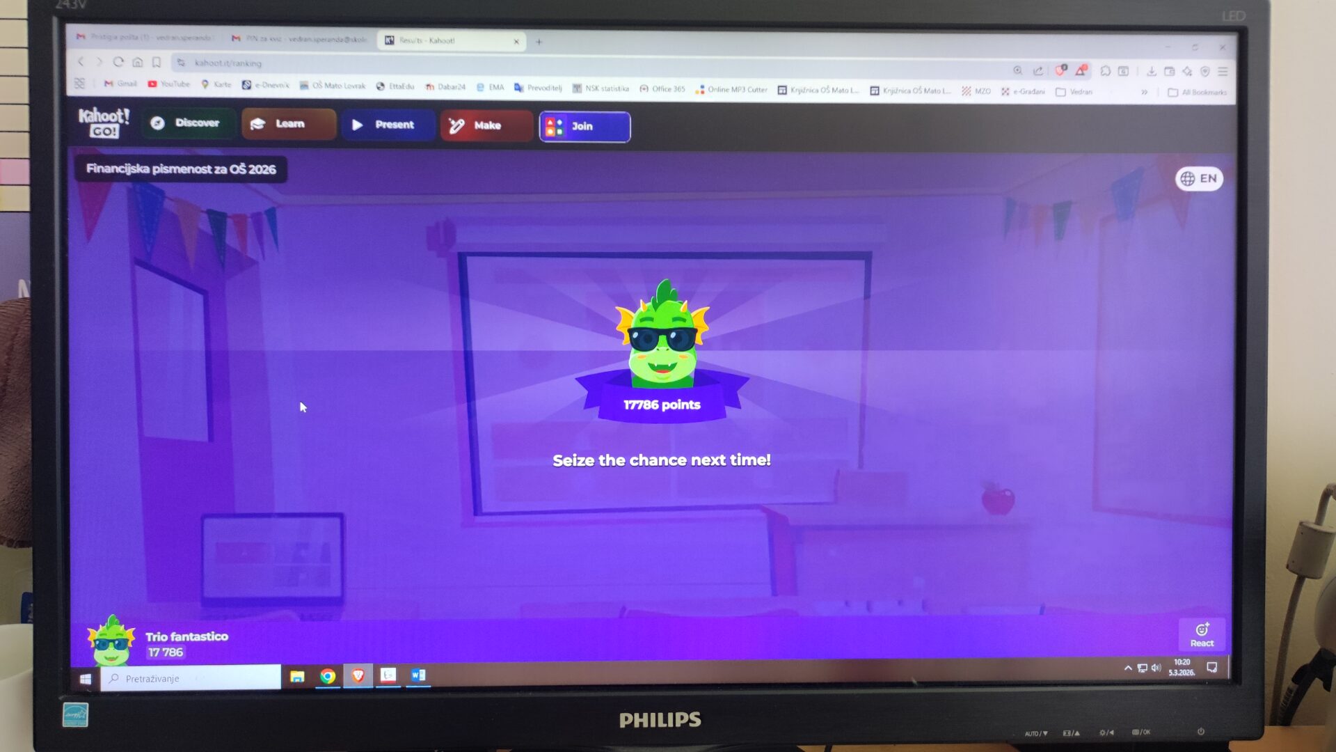 Natjecanje se odvijalo u aplikaciji Kahoot, gdje su učenici što brže i točnije trebali odgovoriti na 20 pitanja iz financijske pismenosti. Obje ekipe su bile izvrsne s učinkom od 19 točnih i 1 netočnim odgovorom, no o konačnom poretku odlučivale su doslovno sekunde, desetinke i stotinke sekundi. Ekipa Trio fantastico tako se plasirala na 38 mjesto, a ekipa Kartica / gotovina na 66 mjesto, od ukupno 533 ekipe, što je za prvo sudjelovanje na ovom natjecanju izvrstan rezultat.