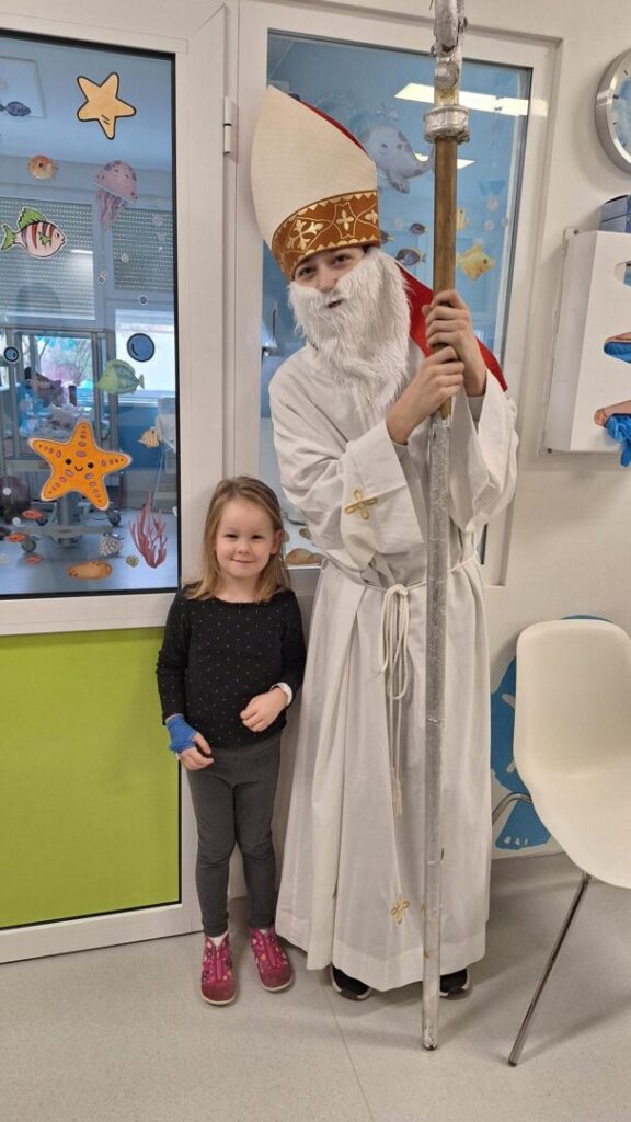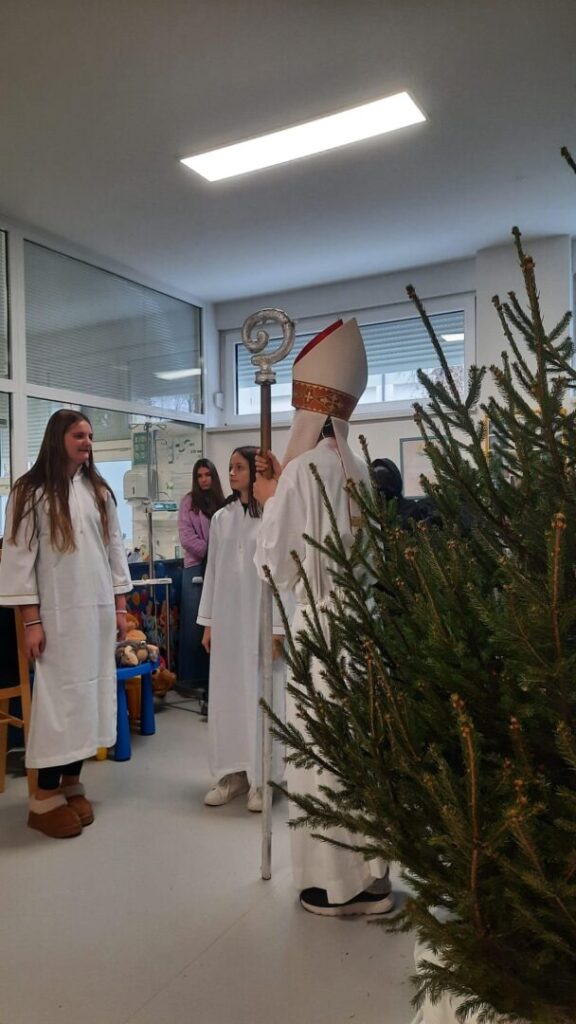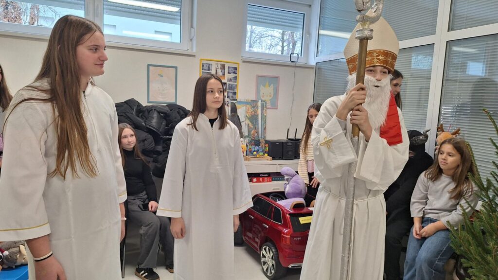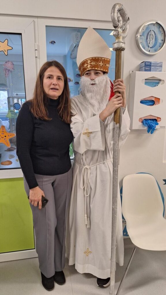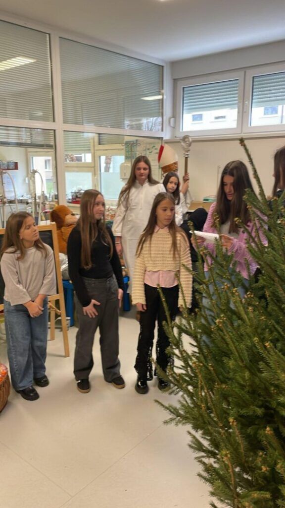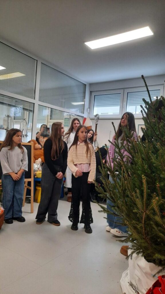 U petak 5.12., u povodu blagdana Sv. Nikole, učenici viših razreda naše škole u pratnji učiteljica Andrijane Petrović i Darije Mikić posjetile su dječji odjel naše bolnice. Mali pacijenti bili su oduševljeni dolaskom sv. Nikole, ali i nestašnog krampusa, koji je na licima mališana izmamio smijeh. Pozorno su pratili igrokaz i pljeskom nagradili naše učenike za njihov trud. Uz prigodan program o dolasku sv.Nikole naši su učenici i darivali male bolesnike poklončićima: cedevitom,bombonima,mandarinama i keksićima.