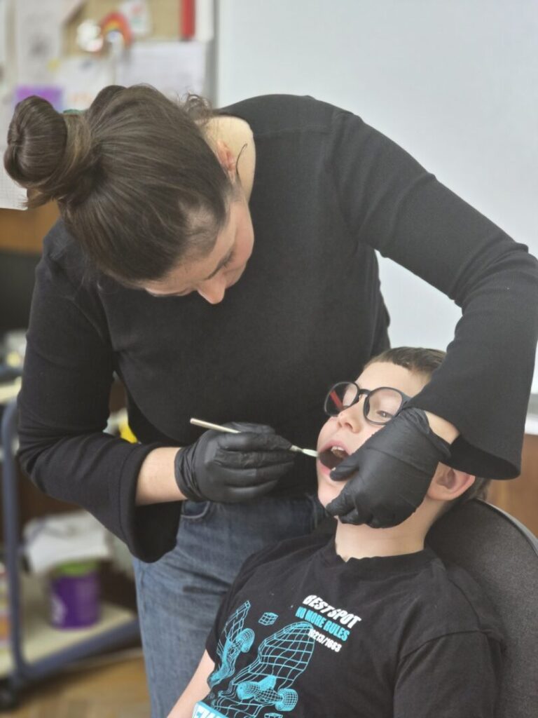 Susret s liječnicom dentalne medicine započeo je pravilnim pranjem zubi, a nastavio se ugodnim razgovorom i pregledom jer se učionica nakratko pretvorila u improviziranu stomatološku ordinaciju.